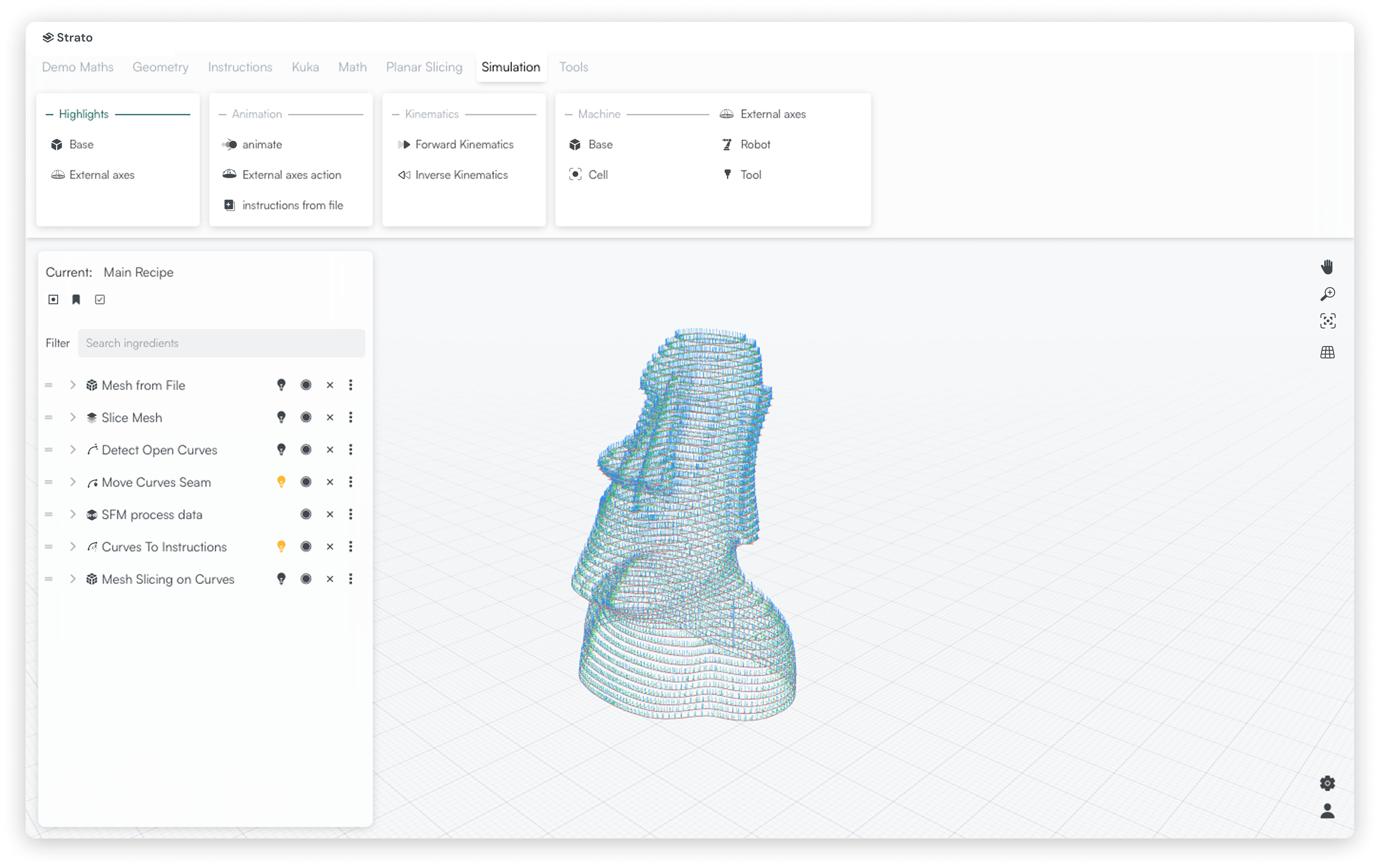Strato is the intelligent core of Moi’s digital manufacturing platform. It is the CAM environment for composite additive manufacturing, handling material-aware toolpath generation and slicing strategies optimized for different additive technologies. Strato is made to adapt, not constrain: slicing is organized around a system of ingredients and recipes. High-level recipes provide ready-to-use workflows for standard operations, while ingredients expose parametric building blocks that allow users to customize strategies and automate complex process pipelines.